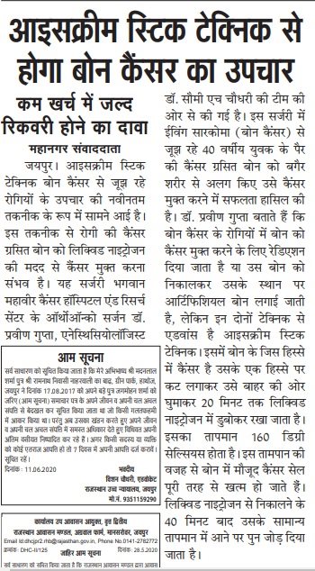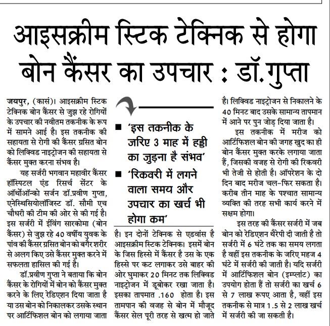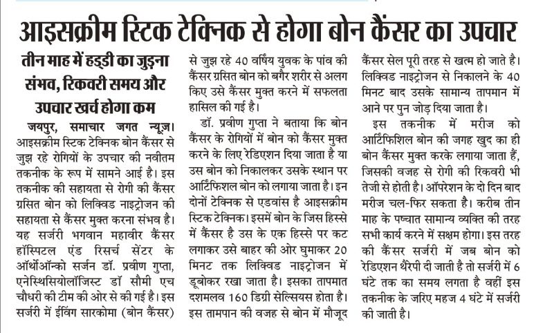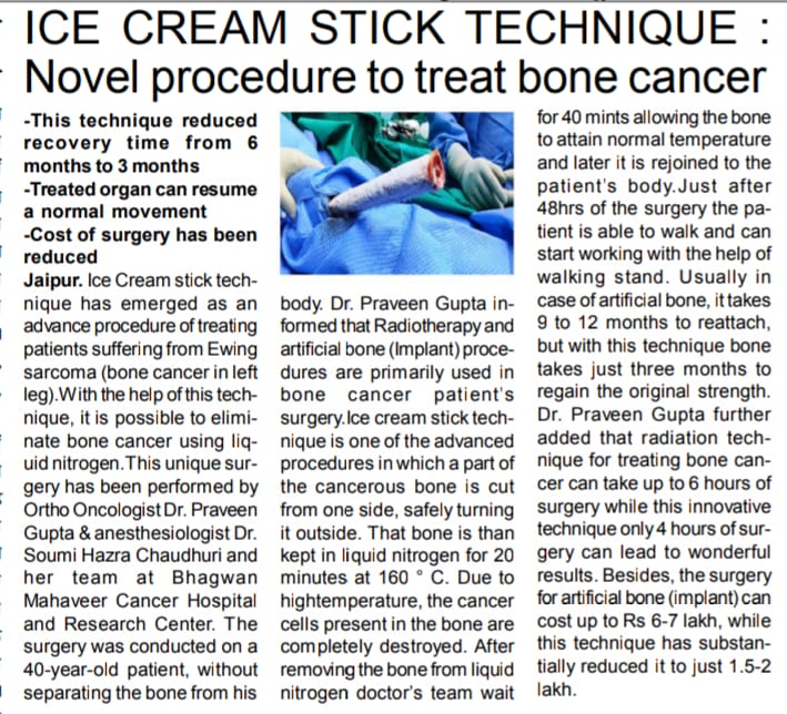 पैर के बोन कैंसर की बीमारी से जूझ रहे मरीजों के लिए एक राहत भरी खबर है। भगवान महावीर कैंसर हॉस्पिटल एंड रिसर्च सेंटर के डॉक्टरों की एक टीम ने बोन कैंसर के इलाज के लिए एक नई तकनीक खोज डाली है। इस तकनीक से मरीज बेहद कम पैसों में अपना इलाज करा सकेंगे। इसी तकनीक के माध्यम से डॉक्टरों ने 40 वर्षिय युवक के पांव की कैंसर ग्रसित बोन को बगैर शरीर से अलग किए उसे कैंसर मुक्त करने में सफलता हासिल की है।