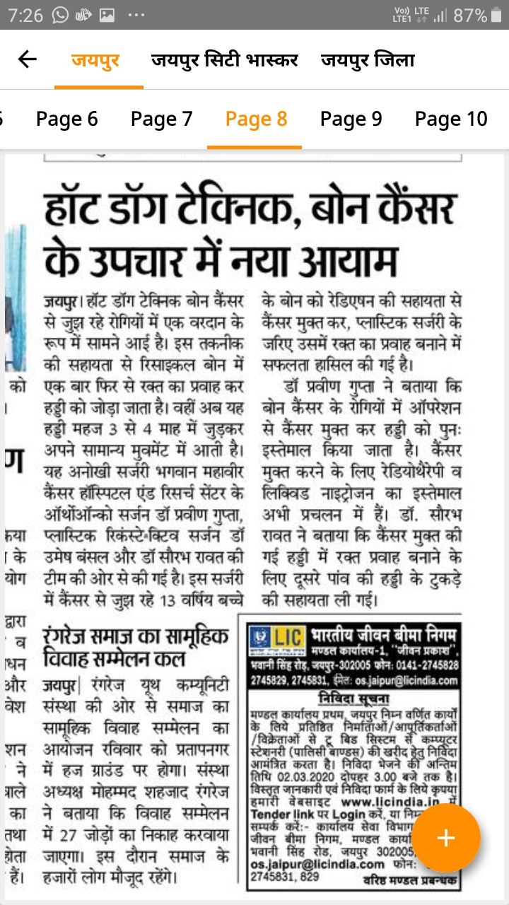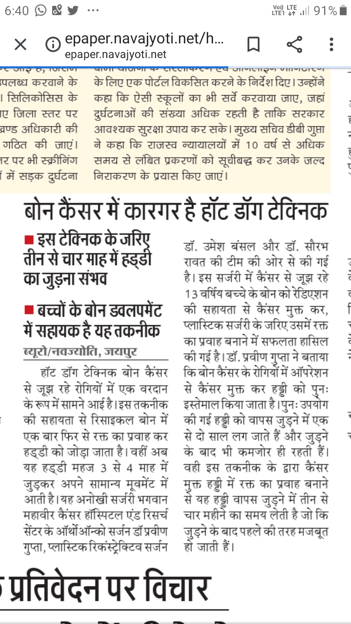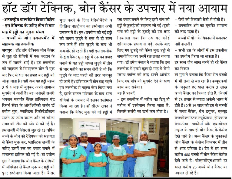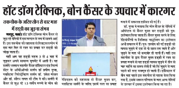 हॉट डॉग टेक्निक बोन कैंसर से जुझ रहे रोगियों में एक वरदान के रूप में सामने आई है। इस तकनीक की सहायता से रिसाइकल बोन में एक बार फिर से रक्त का प्रवाह कर हड्डी को जोड़ा जाता है। वहीं अब यह हड्डी महज 3 से 4 माह में जुड़कर अपने सामान्य मुवमेंट में आती है। यह अनोखी सर्जरी भगवान महावीर कैंसर हॉस्पिटल एंड रिसर्च सेंटर के ऑर्थोऑन्को सर्जन डॉ प्रवीण गुप्ता, प्लास्टिक रिकंस्टेªक्टिव सर्जन डॉ उमेष बंसल और डॉ सौरभ रावत की टीम की ओर से की गई है। इस सर्जरी में कैंसर से जुझ रहे 13 वर्षिय बच्चे के बोन को रेडिएषन की सहायता से कैंसर मुक्त कर, प्लास्टिक सर्जरी के जरिए उसमें रक्त का प्रवाह बनाने में सफलता हासिल की गई है।